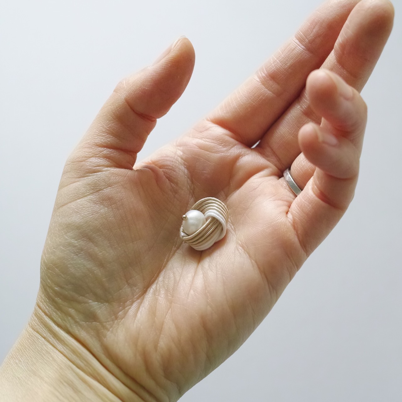 ボリュームある淡水パールの柔らかな光を、たおやかな水引のうねりが包み込みます。